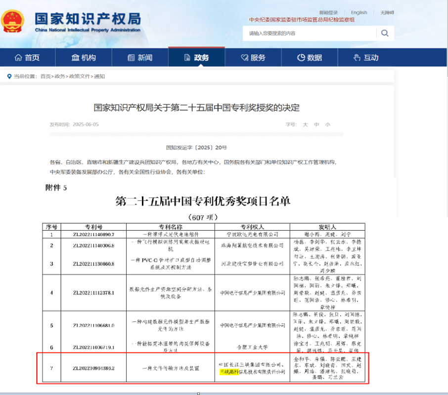 近日,國(guó)家知識(shí)產(chǎn)權(quán)局公布了第二十五屆中國(guó)專利獎(jiǎng)授獎(jiǎng)名單,三峽高科信息技術(shù)有限責(zé)任公司(以下簡(jiǎn)稱 “三峽高科”)與中國(guó)三峽武漢科創(chuàng)園聯(lián)合申報(bào)的發(fā)明專利《一種文件傳輸方法及裝置》榮獲中國(guó)專利優(yōu)秀獎(jiǎng),首獲國(guó)家級(jí)專利獎(jiǎng)項(xiàng),實(shí)現(xiàn)知識(shí)產(chǎn)權(quán)領(lǐng)域新突破。